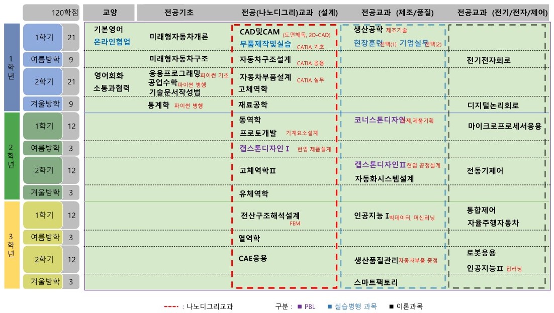 지역의 전통적 강세 산업인 기계, 자동차, 조선 등 부품 제조업 분야의 유능한 엔지니어 양성을 목표로 하고있으며, 특히 내연기관 자동차에서 전기 구동계 차량으로 진화하는 시대의 변화에 대응하는 교육과정을 구성하였습니다. 기계 부품의 설계/해석 과정, 많은 수요가 예상되는 전기 자동차 관련 부품/신사업에 필요한 전기/전자/SW의 융합 과정 및 글로벌 수준의 품질과 생산 시스템 과정을 교육합니다. 그리고 미래형자동차 핵심 부품 기업과 협업을 통하여 지속적으로 성장할 수 있는 인재를 육성하고 미래형 자동차 기술을 선도하는 학과입니다.